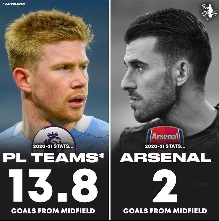 Полузащитники Арсенала в этом сезоне АПЛ забили всего 2 гола в АПЛ. В среднем все полузащитники клубов АПЛ вместе забивают 13.8 голов. Полузащитники Манчестер Юнайтед и Манчестер Сити же забили по 28 голов.
